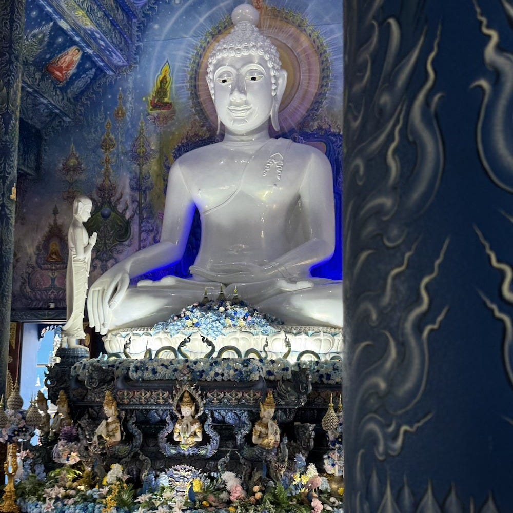 Another contemporary temple, Rong Sue Ten fuses Buddha’s teachings with contemporary flair — the sapphire glow drawing me in like a moth to the big light.